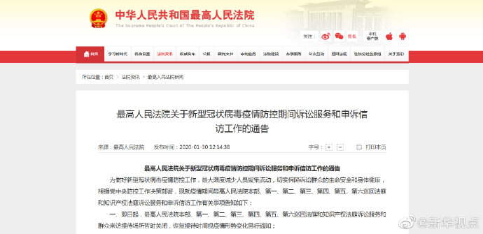 最高人民法院30日發布通告,即日起,最高人民法院本部、第一、第二、第三、第四、第五、第六巡回法庭和知識產權法庭訴訟服務和群眾來訪接待場所暫時關閉,恢復接待時間視疫情形勢變化另行通知;當事人需要提交申請再審材料、申訴信訪或者申請其他訴訟服務事項的,請通過最高人民法院訴訟服務網或者郵寄方式提交,查詢咨詢事項可撥打12368訴訟服務熱線聯系辦理。(記者羅沙)?