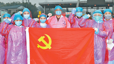 2月5日,在湖南益陽市高速公路鄧石橋出口,參與對(duì)乘車人進(jìn)行體溫監(jiān)測(cè)的康雅醫(yī)院黨員重溫入黨誓詞。為發(fā)揮黨員的模范帶頭作用,益陽各交通要道路口、車站卡口工作人員成立了臨時(shí)黨支部,設(shè)立了黨員示范崗。宣國(guó)祥攝(人民視覺)
