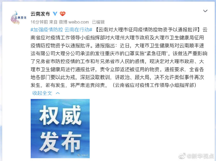 通報(bào)指出:近日,大理市衛(wèi)生健康局對(duì)云南順豐速運(yùn)有限公司大理分公司承運(yùn)的發(fā)往重慶市的口罩實(shí)施“緊急征用”。該做法嚴(yán)重影響了兄弟省市防控疫情的工作和與兄弟省市人民的感情,現(xiàn)決定對(duì)大理市政府、大理市衛(wèi)生健康局進(jìn)行通報(bào)批評(píng),責(zé)令立即返還被征用的物資。通報(bào)要求,全省各地各部門要以此為戒,深刻汲取教訓(xùn),講政治、顧大局,決不允許類似事件再次發(fā)生,若有發(fā)生,將嚴(yán)肅追責(zé)問責(zé)。