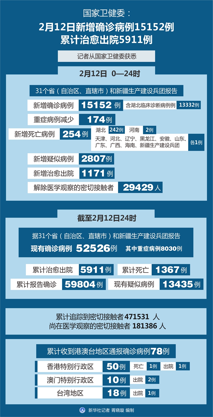 截至2月12日24時,據(jù)31個省(自治區(qū)、直轄市)和新疆生產(chǎn)建設(shè)兵團報告,現(xiàn)有確診病例52526例(其中重癥病例8030例),累計治愈出院病例5911例,累計死亡病例1367例,累計報告確診病例59804例,現(xiàn)有疑似病例13435例。累計追蹤到密切接觸者471531人,尚在醫(yī)學(xué)觀察的密切接觸者181386人。