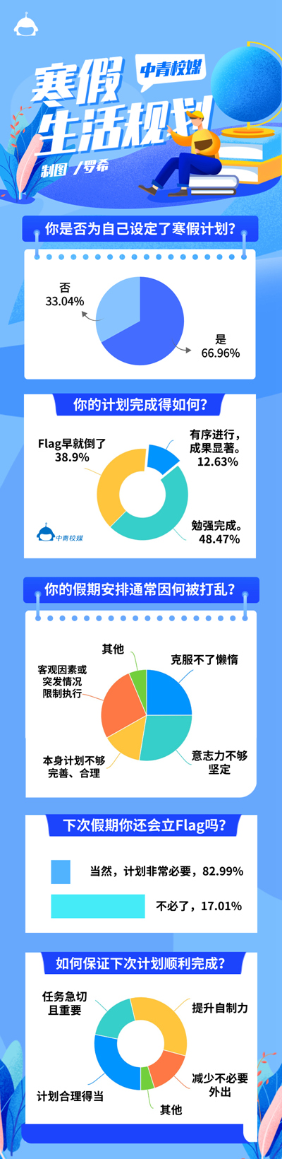 中青校媒調(diào)查顯示,在落實(shí)假期計(jì)劃時(shí),意志力不夠堅(jiān)定(63.19%)、客觀(guān)因素或者突發(fā)情況(62.36%)、克服不了懶惰(57.88%)、計(jì)劃本身不夠合理(33.06%) 等因素都會(huì)干擾計(jì)劃的執(zhí)行。