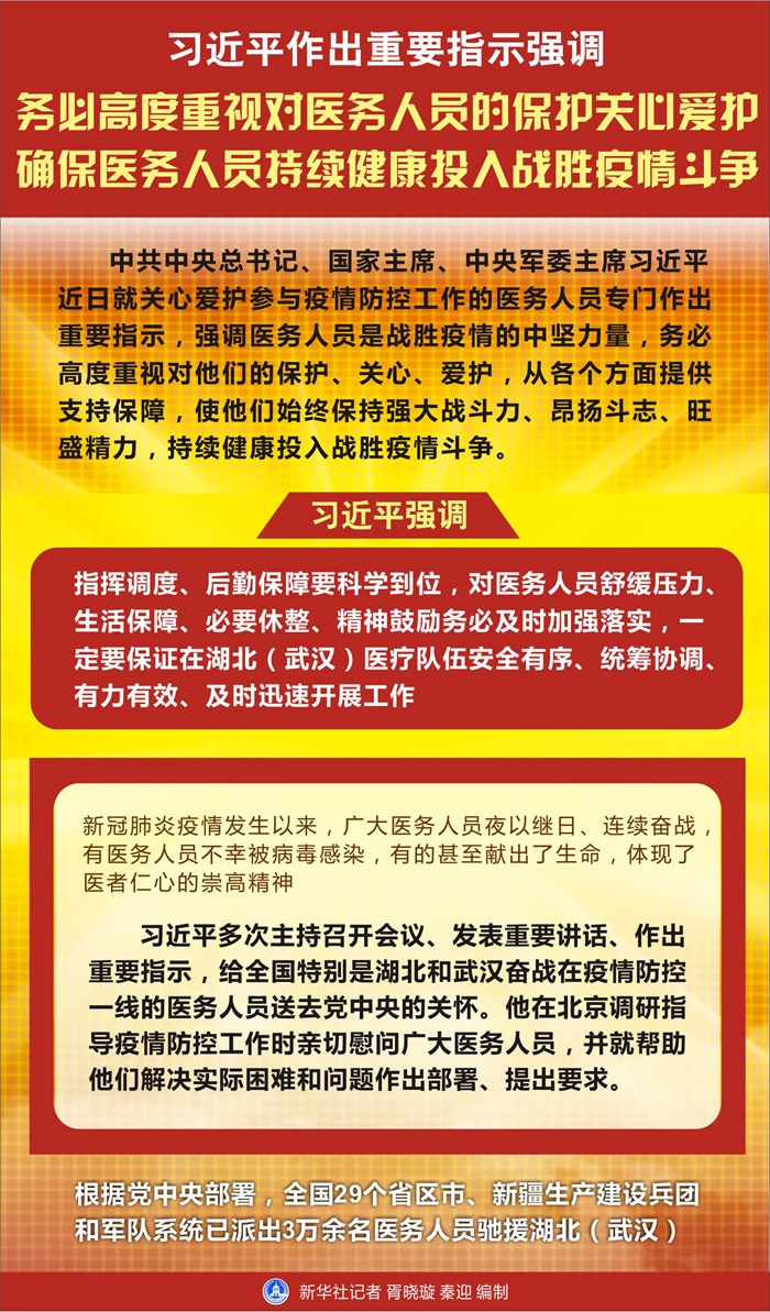 習(xí)近平強(qiáng)調(diào),指揮調(diào)度、后勤保障要科學(xué)到位,對(duì)醫(yī)務(wù)人員舒緩壓力、生活保障、必要休整、精神鼓勵(lì)務(wù)必及時(shí)加強(qiáng)落實(shí),一定要保證在湖北(武漢)醫(yī)療隊(duì)伍安全有序、統(tǒng)籌協(xié)調(diào)、有力有效、及時(shí)迅速開(kāi)展工作。