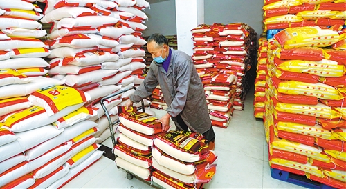 2月18日,四川建國順發商貿有限公司工人在搬卸大米。連日來,該公司每天加班加點為各大超市供應大米。鐘 敏攝(中經視覺)