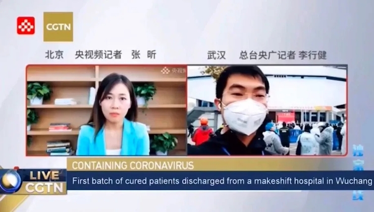 2月11日,中央廣播電視總臺(tái)中國(guó)之聲特別報(bào)道部記者李行健在武昌方艙醫(yī)院前與央視頻連線,并通過CGTN等平臺(tái)同步直播。