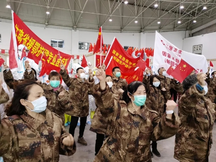 武漢客廳方艙醫(yī)院病區(qū)醫(yī)護(hù)人員代表一起誦讀詩(shī)歌、唱歌。