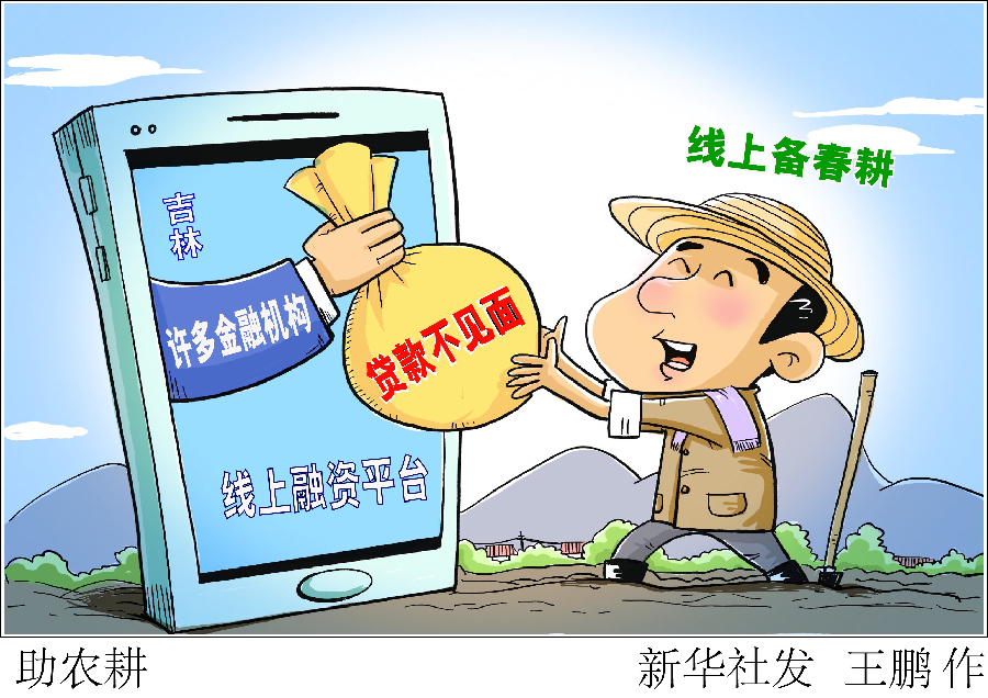 漫畫(huà):助農(nóng)耕 一邊是為了疫情防控盡量少出門,一邊是農(nóng)時(shí)不等人,急需貸款流轉(zhuǎn)土地、購(gòu)買農(nóng)資,如此“兩難”怎么解?在吉林省,許多金融機(jī)構(gòu)建設(shè)了線上融資平臺(tái),農(nóng)民足不出戶就能用手機(jī)辦理貸款。 新華社發(fā) 王鵬 作