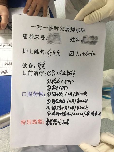 每個護士對應成為一個患者的臨時家屬,只為這一個患者解決問題,心理疏導;要進行疾病健康教育,在生活上必需品方便給予幫助,只要能辦到的,盡量想辦法,辦不到給予解釋就好;要讓患者認識你,知道我們這個方案和認識你這個護士,有困難找你,和醫生成為一個溝通橋梁;不要求每天去看護臨時親屬,而是在上班時間,去問候一下,問問需要你做什么;當你休息幾天時,提前告知,讓他知道,你這個臨時家屬不在,有緊急要求,可以找任何護士。