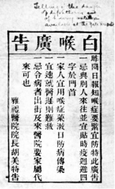 雅禮醫院院長胡美簽發的預防白喉病的廣告