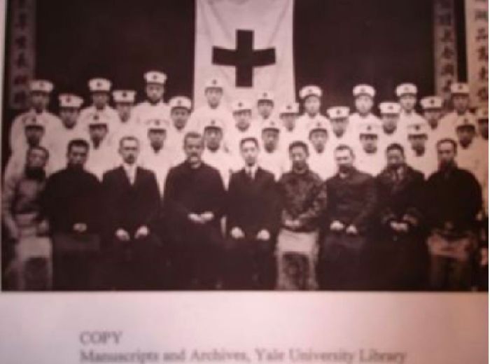 參加京漢鐵路鼠疫防治的同仁合影,前排左起第五為顏福慶(原件藏耶魯大學圖書館)