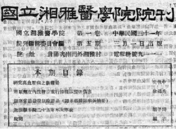 1942年3月1日《國立湘雅醫學院院刊》第一卷第五期封面;第三條為“湖南常德發現鼠疫經過(譚學華醫師來函摘要)”