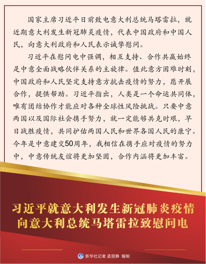 習近平在慰問電中強調,相互支持、合作共贏始終是中意全面戰略伙伴關系的主旋律。值此意方困難時刻,中國政府和人民堅定支持意方抗擊疫情的努力,愿開展合作,提供幫助。習近平指出,人類是一個命運共同體,唯有團結協作才能應對各種全球性風險挑戰。只要中意兩國以及國際社會攜手努力,就一定能夠共克時艱,早日戰勝疫情,共同護佑兩國人民和世界各國人民的康寧。今年是中意建交50周年,我相信在攜手應對疫情的努力中,中意傳統友誼將更加堅固,合作內涵將更加豐富。