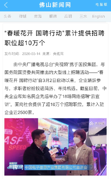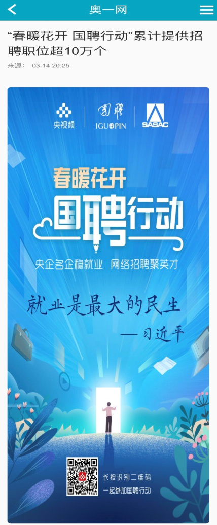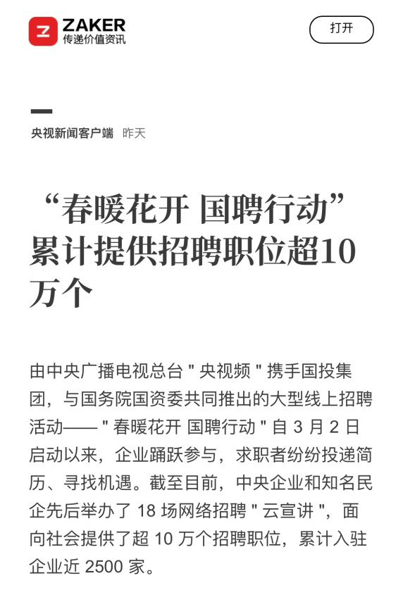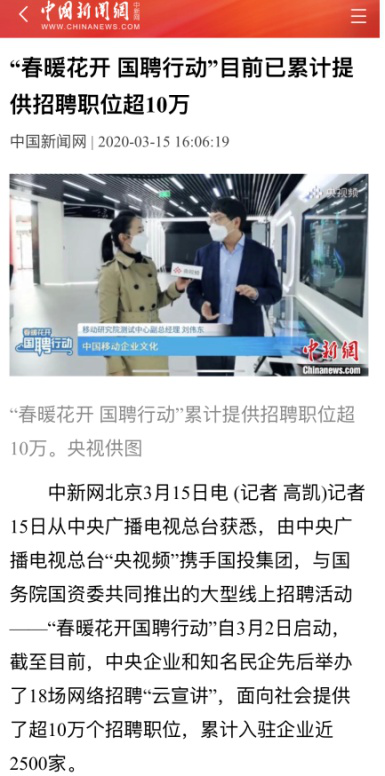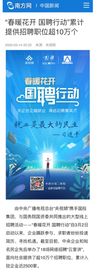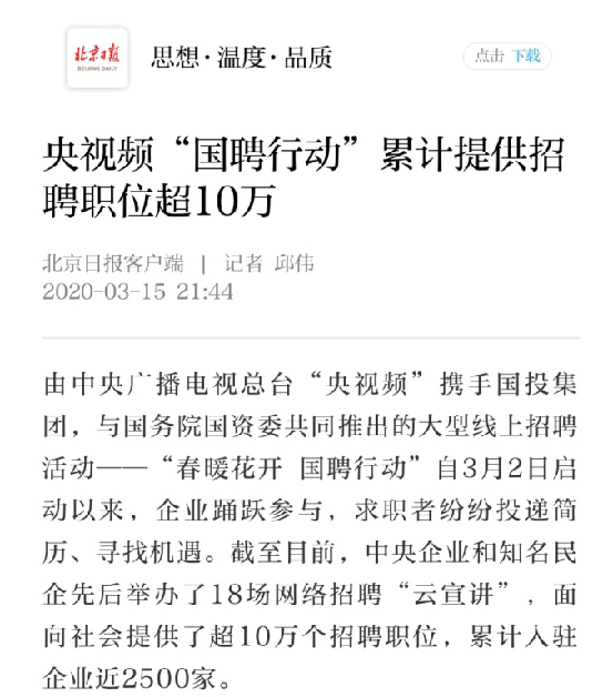 由中央廣播電視總臺“央視頻”攜手國投集團,與國務院國資委共同推出的大型線上招聘活動——“春暖花開 國聘行動”,自3月2日啟動以來,企業(yè)踴躍參與,求職者紛紛投遞簡歷。截至3月14日已面向社會提供了超10萬個招聘職位,累計入駐企業(yè)近2500家,引發(fā)眾多媒體和網(wǎng)站轉載報道。
