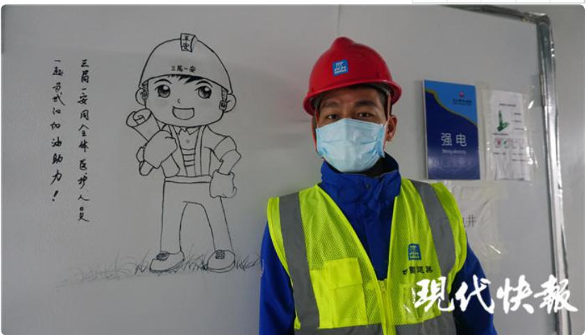 許新焰看到醫護人員通道的一面墻空著,就用一組漫畫,把中建三局建設醫院對抗 " 疫魔 " 的過程,用9幅漫畫體現出來。" 就是想給醫護人員、志愿者和我們這些維保隊員力量,我們用幾天時間就把醫院建起來了,這樣的速度,不怕疫魔。" 他說,每幅漫畫大約需要耗費一兩個小時,有時畫著畫著就要出工,前前后后花了七八天的時間,才把整組漫畫全部畫完。
