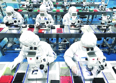 江蘇連云港海州經濟開發區內一公司,工人正在加緊生產一批海外企業配套的手機攝像頭產品。耿玉和攝/光明圖片