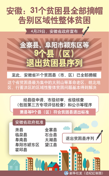 新華社合肥4月29日電(記者姜?jiǎng)偅?9日,安徽省政府宣布,金寨縣、阜陽市潁東區(qū)等9個(gè)縣(區(qū))退出貧困縣序列。至此,安徽省31個(gè)貧困縣(市、區(qū))已全部摘帽,這個(gè)省貧困縣最為集中的大別山等革命老區(qū)、皖北地區(qū)、行蓄洪區(qū)的區(qū)域性整體貧困問題基本得到解決。