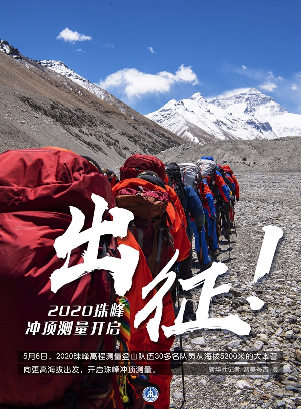 6日,2020珠峰高程測量行動測量登山隊舉行出發儀式,30多名計劃登頂的測量登山隊員當日從海拔5200米的珠峰登山大本營向更高海拔出發,計劃抓住近日的天氣窗口,擇日登頂測量。如果成功,這將成為我國專業測繪人員首次登頂珠峰測高。