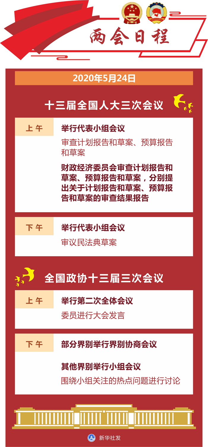 新華社北京5月23日電? 24日上午,十三屆全國人大三次會議舉行代表小組會議,審查計劃報告和草案、預算報告和草案;財政經濟委員會審查計劃報告和草案、預算報告和草案,分別提出關于計劃報告和草案、預算報告和草案的審查結果報告。下午舉行代表小組會議,審議民法典草案。