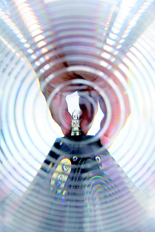 葉超群在燈塔上更換破損的燈泡。