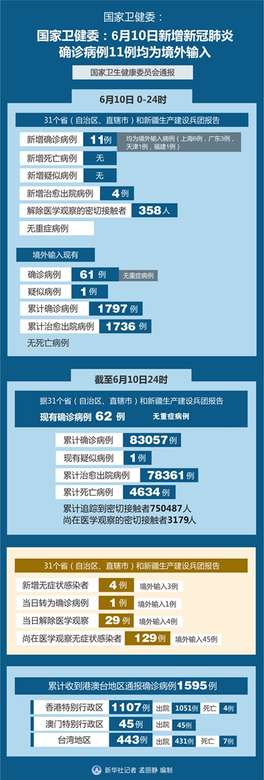 截至6月10日24時(shí),據(jù)31個(gè)省(自治區(qū)、直轄市)和新疆生產(chǎn)建設(shè)兵團(tuán)報(bào)告,現(xiàn)有確診病例62例(無(wú)重癥病例),累計(jì)治愈出院病例78361例,累計(jì)死亡病例4634例,累計(jì)報(bào)告確診病例83057例,現(xiàn)有疑似病例1例。累計(jì)追蹤到密切接觸者750487人,尚在醫(yī)學(xué)觀察的密切接觸者3179人。