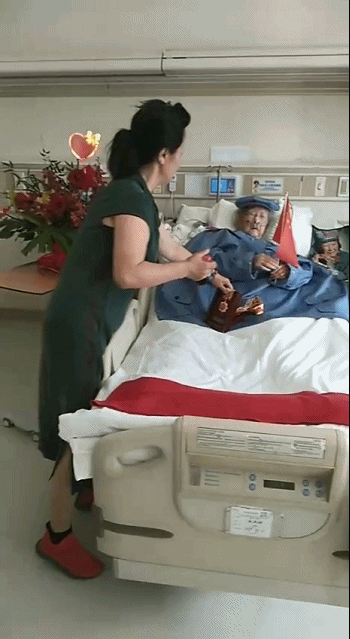 2019年10月1日,中華人民共和國(guó)迎來(lái)七十華誕。素來(lái)了解老人心思的陽(yáng)瓊仙,專門(mén)帶了兩面國(guó)旗到病房里。閱兵開(kāi)始后,滿頭銀發(fā)的王定國(guó)半躺在病床上,一手拿一面旗,隨著軍樂(lè)的節(jié)奏來(lái)回?fù)]舞,累了,歇一下,又接著揮,仿佛自己正身處天安門(mén)廣場(chǎng)熱情歡呼的人群中。