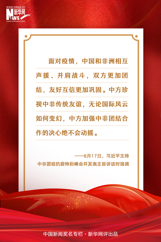 新老朋友通過視頻相聚,共商團結(jié)抗疫大計,共敘中非兄弟情誼。6月17日,由中國和非洲聯(lián)盟輪值主席國南非、中非合作論壇共同主席國塞內(nèi)加爾共同發(fā)起的中非團結(jié)抗疫特別峰會舉行。國家主席習(xí)近平在北京主持了這一峰會,并發(fā)表題為《團結(jié)抗疫 共克時艱》的主旨講話,強調(diào)中非要堅定不移攜手抗擊疫情、推進中非合作、踐行多邊主義、推進中非友好,共同打造中非衛(wèi)生健康共同體,推進中非全面戰(zhàn)略合作伙伴關(guān)系高水平發(fā)展。