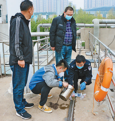 濟南的禁毒民警、禁毒社工在現場采集污水樣品。賈衛國攝