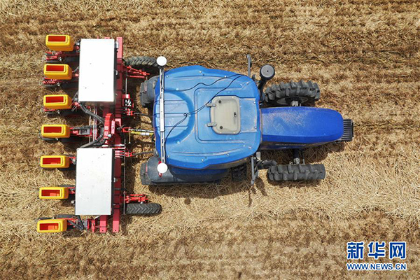 在河南省鄧州市小楊營鎮安眾村,加裝有北斗導航系統的拖拉機在無人駕駛狀態下播種(2020年5月26日攝,無人機照片)。新華社記者馮大鵬攝