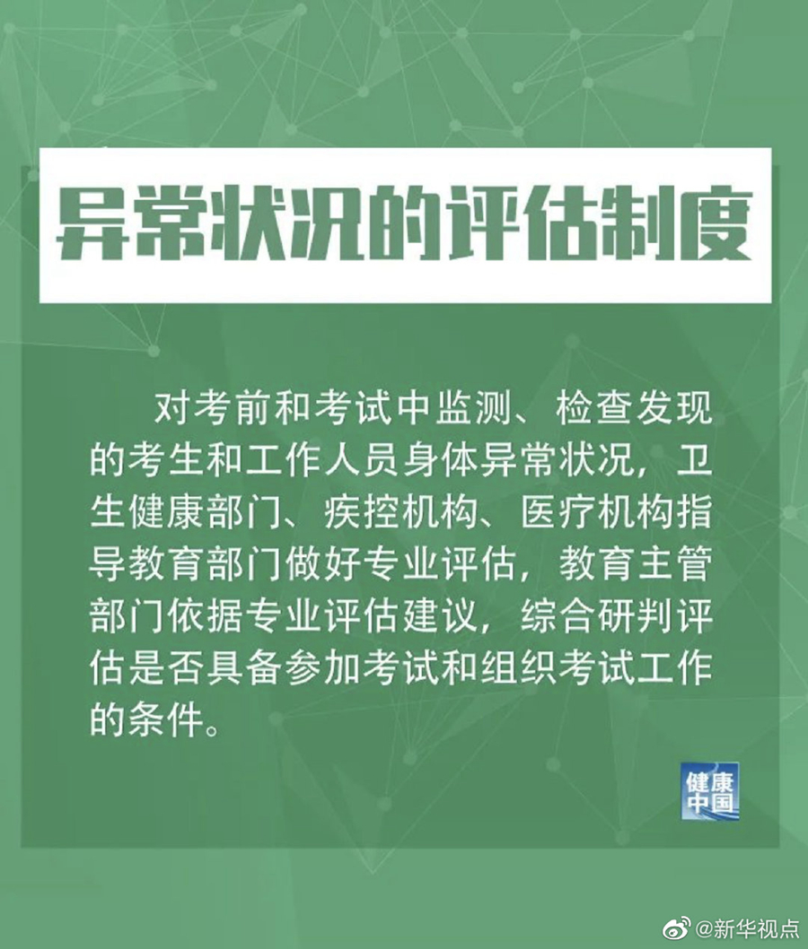 考試過程中有發熱、咳嗽等呼吸道癥狀者,措施提到,由考點當地的衛生健康部門、疾控機構和醫療機構專業人員進行個案研判,具備繼續完成考試條件的考生,須安排在備用隔離考場考試??忌鷱钠胀紙鲛D移至備用隔離考場(未出考點)所耽誤的時間,經省級招生考試機構批準予以補齊。當科目考試結束時,由負責研判的專業人員當場簡要向所有考生進行解釋和說明,避免其他考生恐慌。