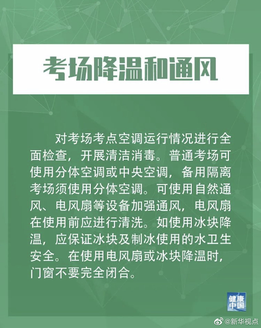 對于備用考場的設置,措施提到,原則上每10個普通考場設1個備用隔離考場(每考點不得少于3個)。當考試當天有發熱、咳嗽等呼吸道癥狀的考生,啟用備用隔離考場。原則上須一人一間,備用隔離考場不夠用時,可采取最前排、最后排或四角排位的方式多人共用一間(最多不超過4人)。