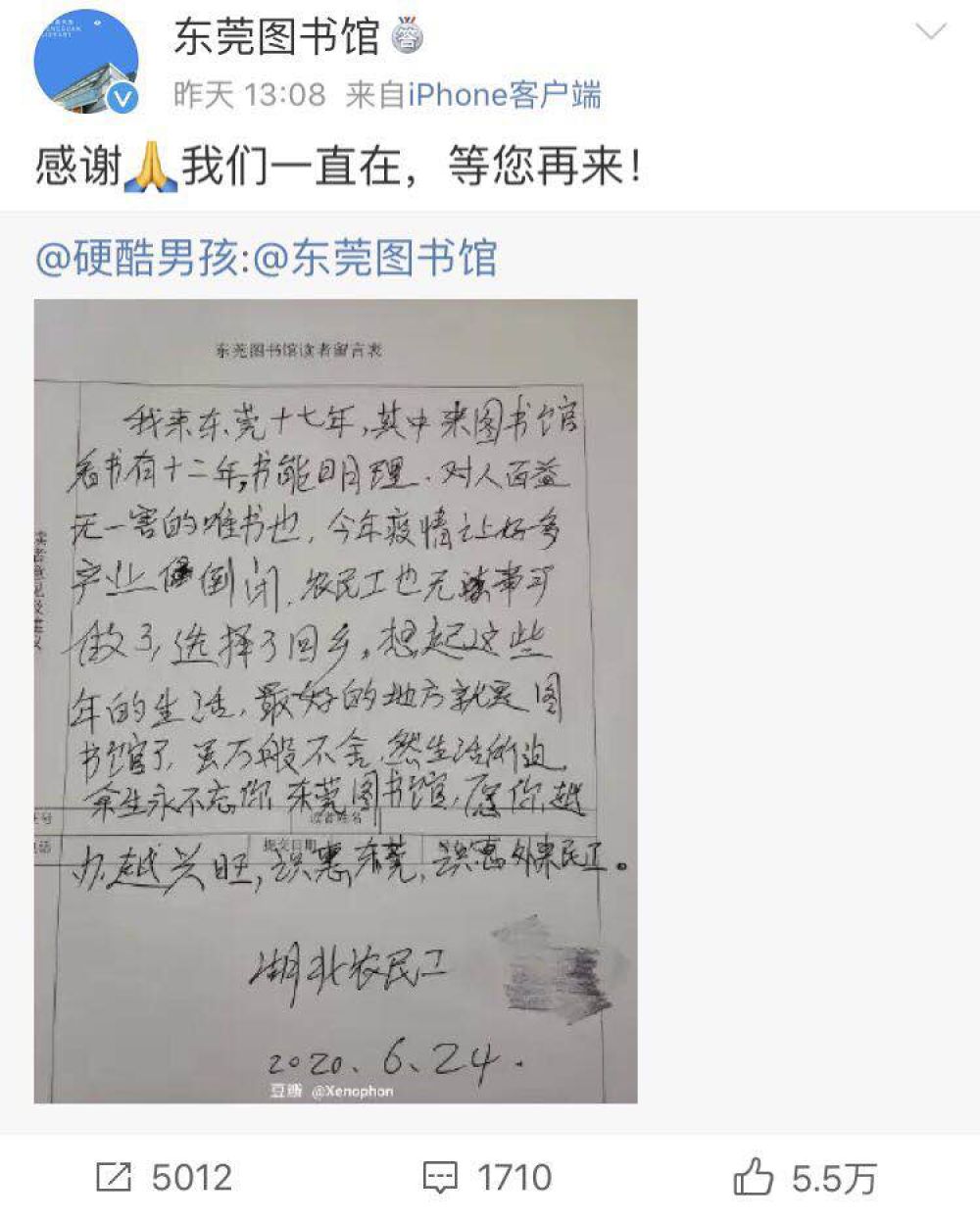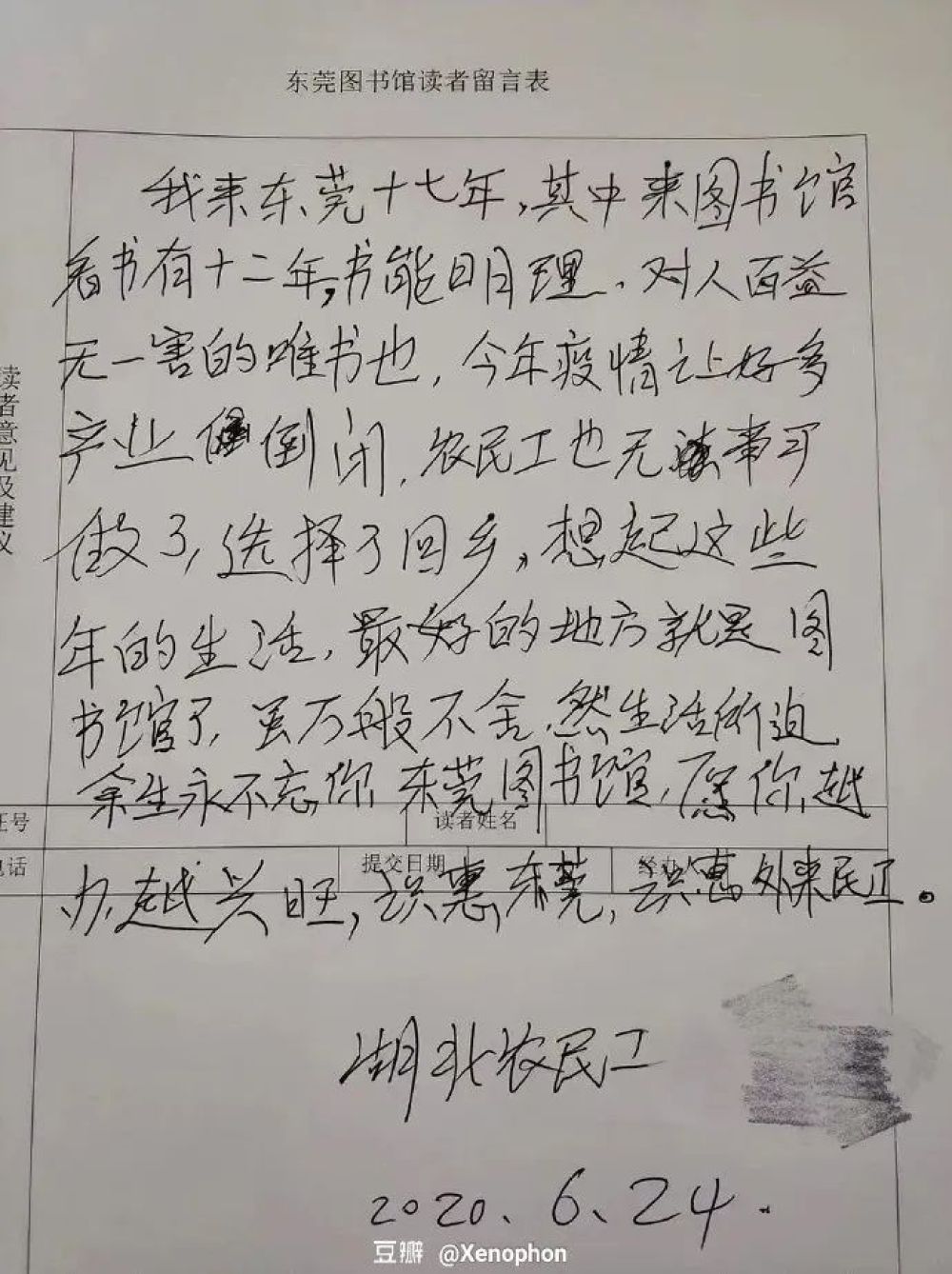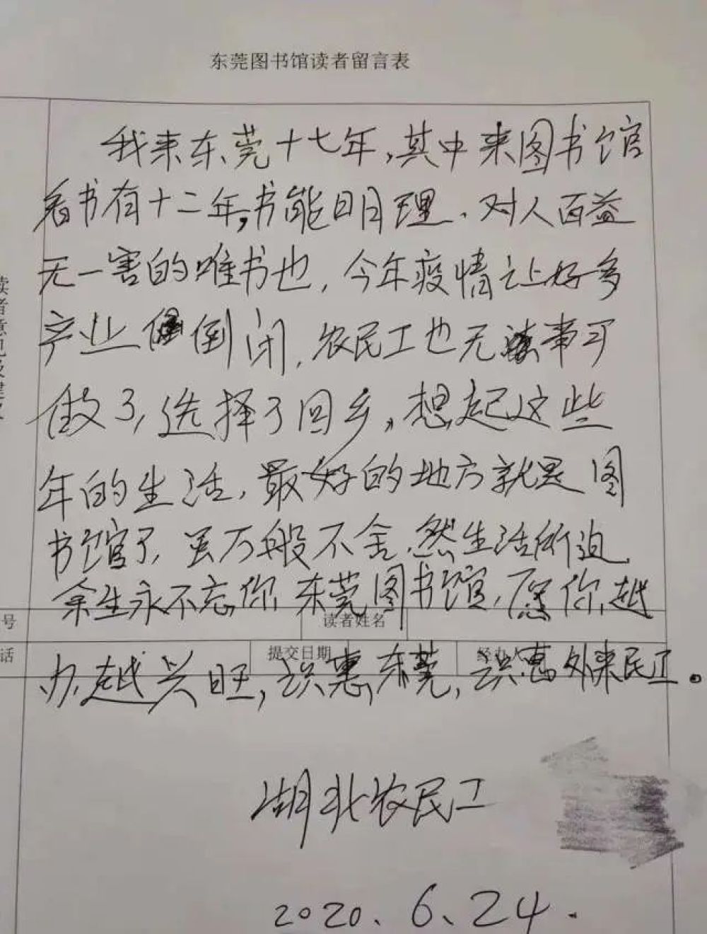 “我來東莞十七年,其中來圖書館看書有十二年。書能明理,對人百益無一害的唯書也。今年疫情讓好多產業(企業)倒閉,農民工也無事可做了,選擇了回鄉。想起這些年的生活,最好的地方就是圖書館了。雖萬般不舍,然生活所迫,余生永不忘你,東莞圖書館,愿你越辦越興旺。識惠東莞,識惠外來農民工。”