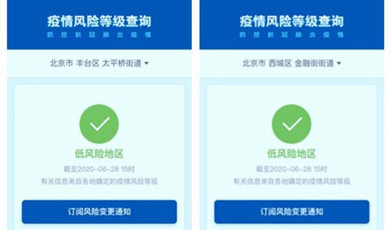 記者從國(guó)務(wù)院客戶(hù)端小程序“疫情風(fēng)險(xiǎn)等級(jí)查詢(xún)”上了解到,截至6月28日15時(shí),北京市西城區(qū)金融街街道、豐臺(tái)區(qū)太平橋街道由疫情中風(fēng)險(xiǎn)地區(qū)變更為低風(fēng)險(xiǎn)地區(qū)。