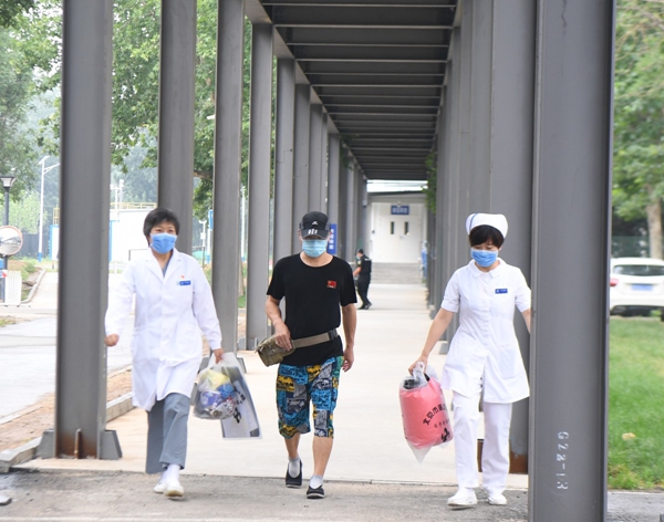 今天出院的老何戴著棒球帽,穿著黑色的短袖衫,綠底兒的沙灘褲,一身輕松。站在地壇醫(yī)院南門廣場(chǎng),老何的口罩戴得嚴(yán)嚴(yán)實(shí)實(shí),他說自己在新發(fā)地市場(chǎng)買點(diǎn)牛羊肉,口罩沒戴嚴(yán)實(shí),“提醒咱們市民一定要做好防控,戴好口罩。”