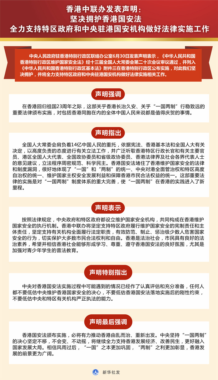 新華社香港6月30日電? 中央人民政府駐香港特別行政區聯絡辦公室30日發表聲明表示,《中華人民共和國香港特別行政區維護國家安全法》經十三屆全國人大常委會第二十次會議審議通過,并列入《中華人民共和國香港特別行政區基本法》附件三在香港特別行政區公布實施,對此我們堅決擁護,并將全力支持特區政府和中央駐港國安機構做好法律實施相關工作。