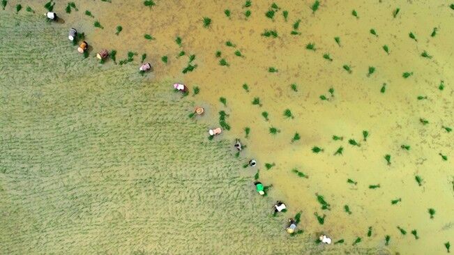 站在堤壩上,記者看到,身穿迷彩服的巡查隊員一字排開,緩慢向前推進,隊員們每人手持一根長長的竹竿撥開雜草,仔細觀察地面是否有泡泉或管涌出現。