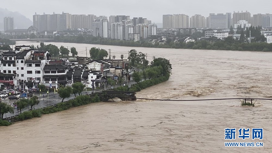 7月7日拍攝的被沖毀的黃山屯溪老大橋。當日上午,安徽黃山屯溪老大橋被洪水沖垮毀壞。屯溪老大橋又叫鎮(zhèn)海橋,始建于明代。新華社發(fā)(施亞磊 攝)