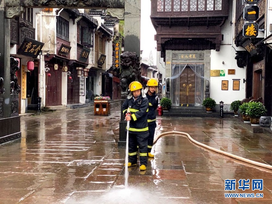 8日上午,屯溪老街正安排清理淤泥雜物,清洗消殺街道,力爭早日恢復正常。(黃山市屯溪老街街道辦事處提供)