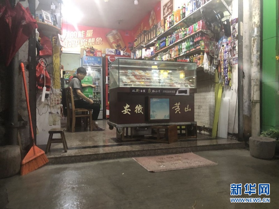 不遠處,已在老街做了20多年生意的蔣圣立正在清理店里的貨物,地面濕漉漉的。“水進了柜臺,一些茶葉包裝盒來不及搬,被水泡了,水最深時淹到小腿了。”他捋起褲管說,“很多年沒有見過這樣大的水了,我得趕緊收拾干凈,希望明天能照常營業(yè)。”
