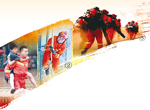 圖①:今年6月底,受暴雨影響,重慶市龍?zhí)逗友鼐€地區(qū)被淹。圖為消防隊員踏水背出受困群眾。肖樂峰攝(人民視覺) 圖②:在山東省煙臺市消防救援支隊培訓基地,消防隊員正在參加繩索攀爬比賽。孫文潭攝(人民視覺) 圖③:今年5月,甘肅省森林消防總隊張掖支隊開展了實戰(zhàn)滅火演練。圖為消防隊員奔赴演練火場。張小軍攝(人民視覺)