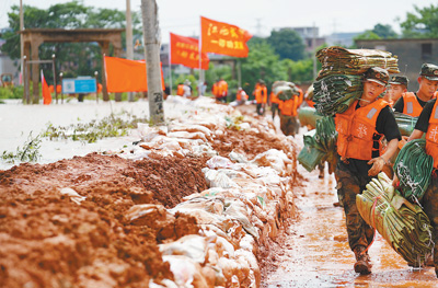 11日,武警戰(zhàn)士在江西鄱陽縣鄱陽鎮(zhèn)江家?guī)X村搬運(yùn)抗洪物資。新華社記者 周 密攝
