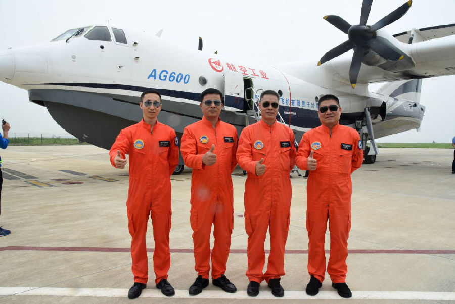 7月26日,機組人員在水陸兩棲飛機AG600成功進行海上首飛返回日照山字河機場后合影。新華社記者 王凱 攝