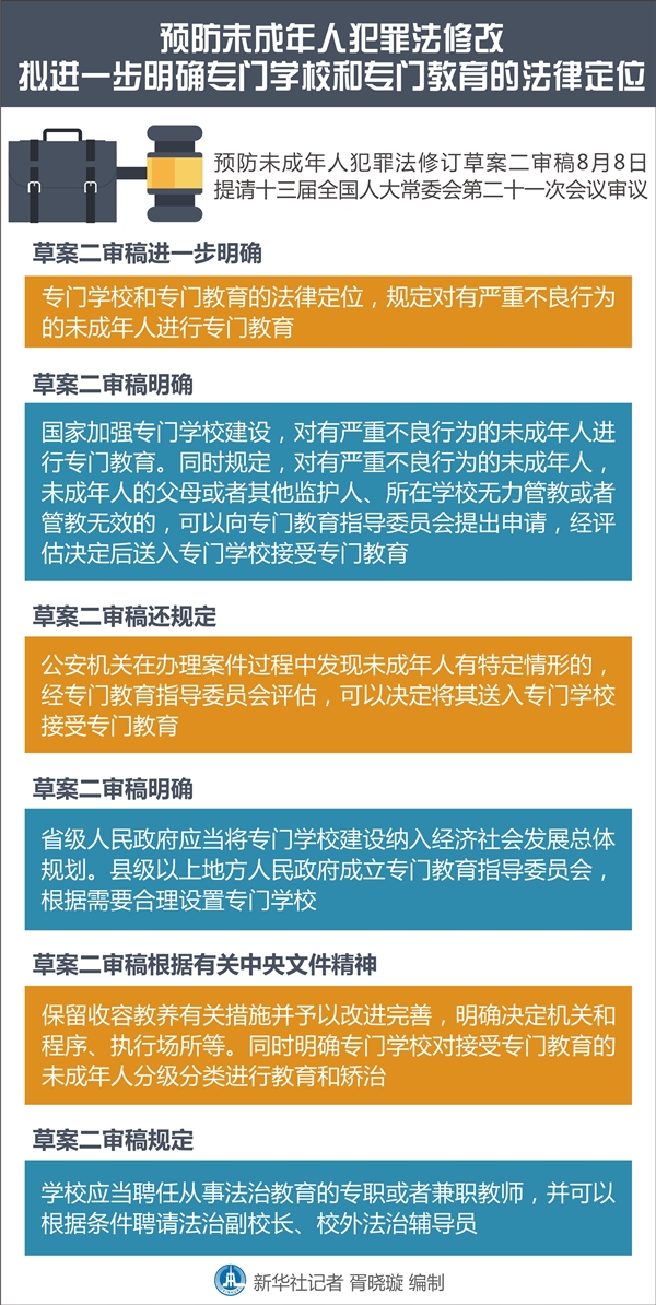 新華社北京8月8日電(記者熊豐)預(yù)防未成年人犯罪法修訂草案二審稿8日提請十三屆全國人大常委會第二十一次會議審議。草案二審稿進一步明確專門學(xué)校和專門教育的法律定位,規(guī)定對有嚴重不良行為的未成年人進行專門教育。