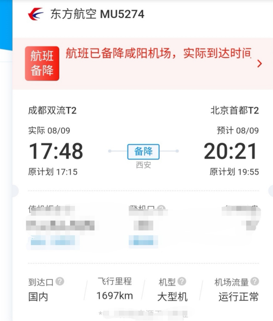 9日傍晚備降西安的東航MU5274次航班上的乘客已更換飛機(jī),于9日21:43,從西安咸陽國際機(jī)場(chǎng)起飛前往目的地北京。