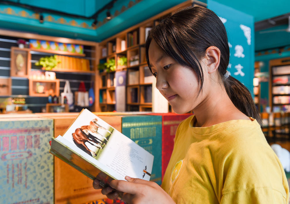8月4日,錫林花在錫林浩特市的新華書店內閱讀與蒙古馬文化有關的書籍。