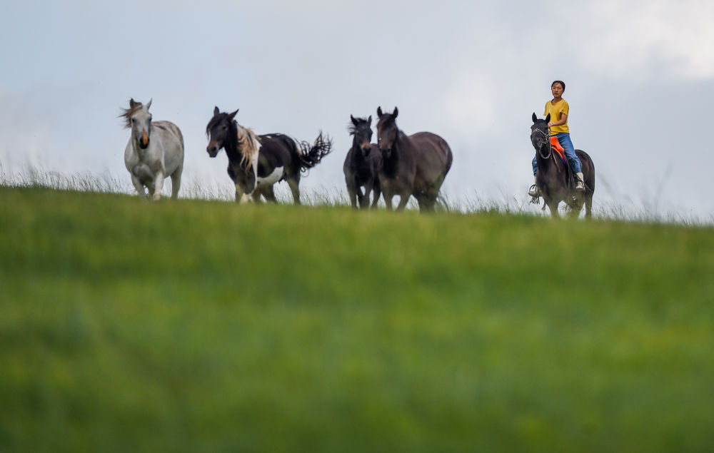 8月4日,錫林花在自家的牧場上驅趕馬群。