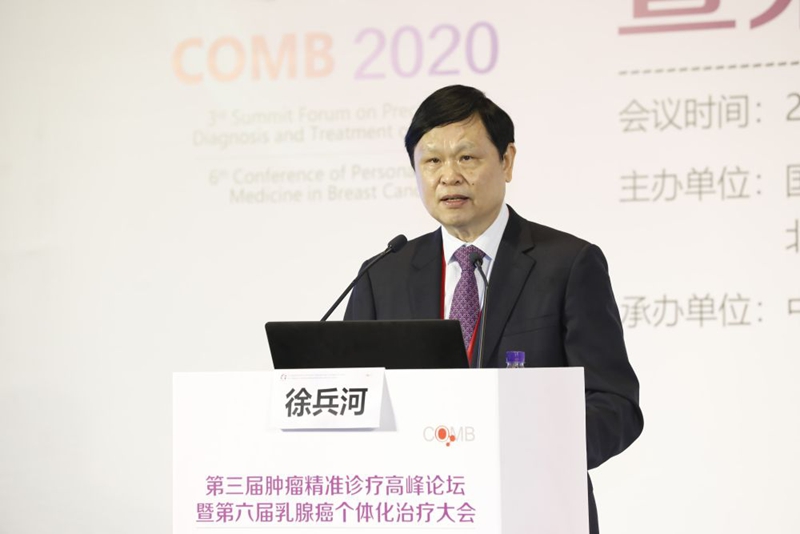 國家腫瘤質控中心乳腺癌專家委員會主任委員、中國醫學科學院腫瘤醫院徐兵河教授在第六屆乳腺癌個體化治療大會上發言。圖片由受訪者提供
