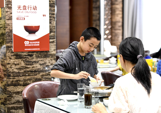 8月15日,記者走進(jìn)位于內(nèi)蒙古自治區(qū)呼和浩特市的一家粵菜餐廳,一進(jìn)門(mén)就看到倡導(dǎo)“光盤(pán)行動(dòng)”的海報(bào),每張餐桌旁也都張貼著“節(jié)約糧食”“使用公筷”的標(biāo)語(yǔ)。