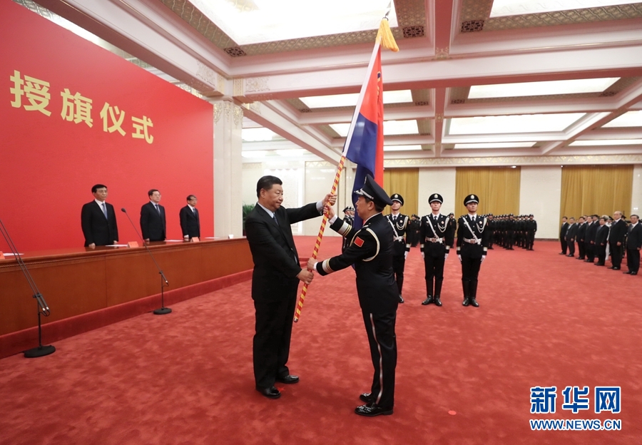 儀仗隊員護衛著中國人民警察警旗,正步行進到主席臺前。習近平分別向公安部部長、總警監趙克志,國家安全部部長、總警監陳文清授旗。趙克志、陳文清向習近平敬禮,從習近平手中接過中國人民警察警旗,面向全場展旗。全場人民警察向警旗莊嚴敬禮。