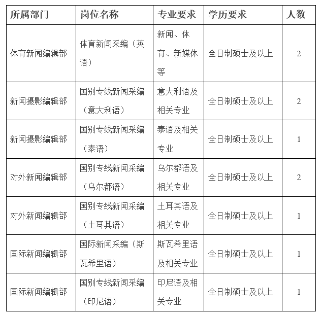 應(yīng)聘者只可報(bào)考一個(gè)崗位,如有崗位調(diào)劑需求以新華社通知為準(zhǔn)。