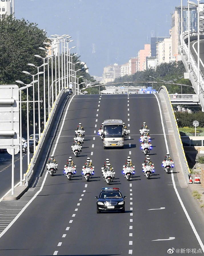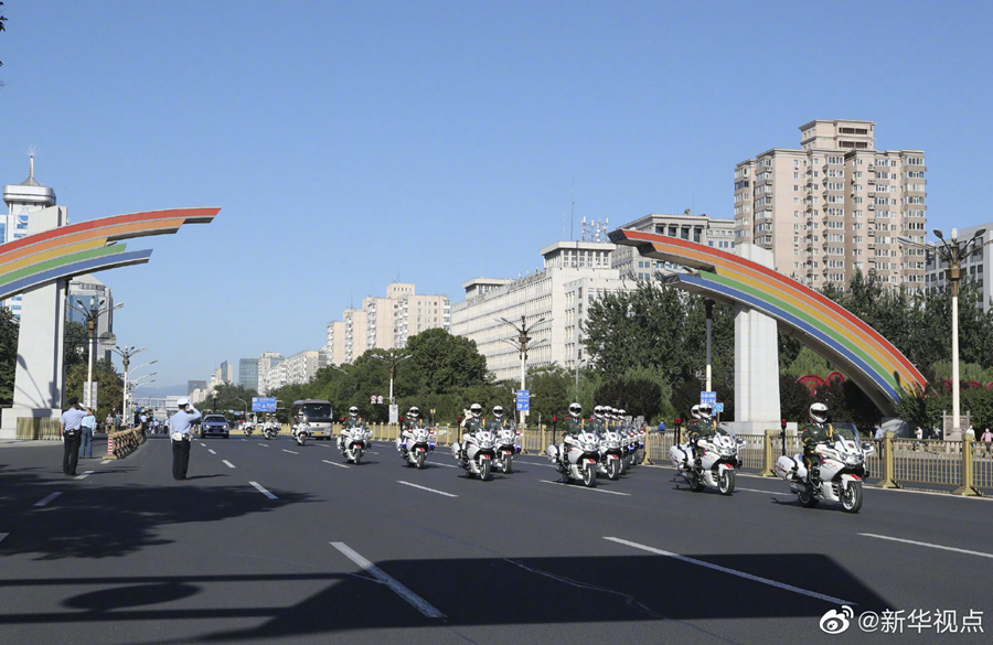 國家勛章和國家榮譽(yù)稱號獲得者集體乘坐禮賓車從住地出發(fā),由國賓護(hù)衛(wèi)隊(duì)護(hù)衛(wèi)前往人民大會堂。(攝影 丁林 高潔 劉彬)