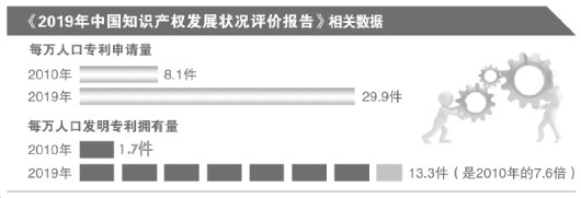 近日,國家知識(shí)產(chǎn)權(quán)局知識(shí)產(chǎn)權(quán)發(fā)展研究中心發(fā)布《2019年中國知識(shí)產(chǎn)權(quán)發(fā)展?fàn)顩r評(píng)價(jià)報(bào)告》(以下簡稱《報(bào)告》)。《報(bào)告》顯示,從2010年到2019年,每萬人口專利申請(qǐng)量由8.1件增加到29.9件,每萬人口發(fā)明專利擁有量在2019年達(dá)到13.3件,是2010年的7.6倍;每萬人口商標(biāo)申請(qǐng)量由7.0件增加到53.3件;每萬人口著作權(quán)登記量由3.4件提高到30件。
